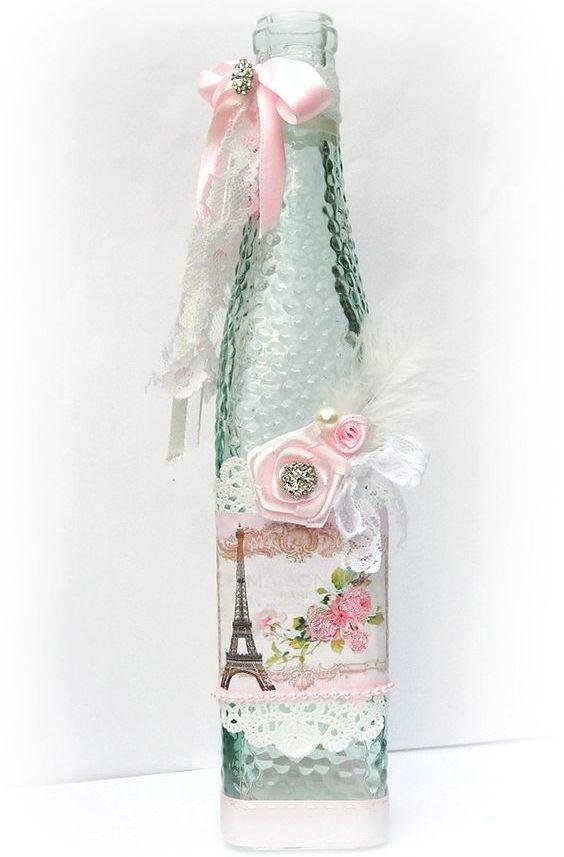 Reproduza alguma ou muitas das ideias de enfeites com garrafas que você vai ver, para que a novidade esteja presente em sua vida no dia de hoje. Há: garrafas decoradas com renda e pérola, garrafas de vidro decoradas com tecido, entre muitas outras.