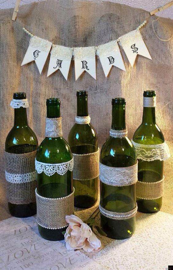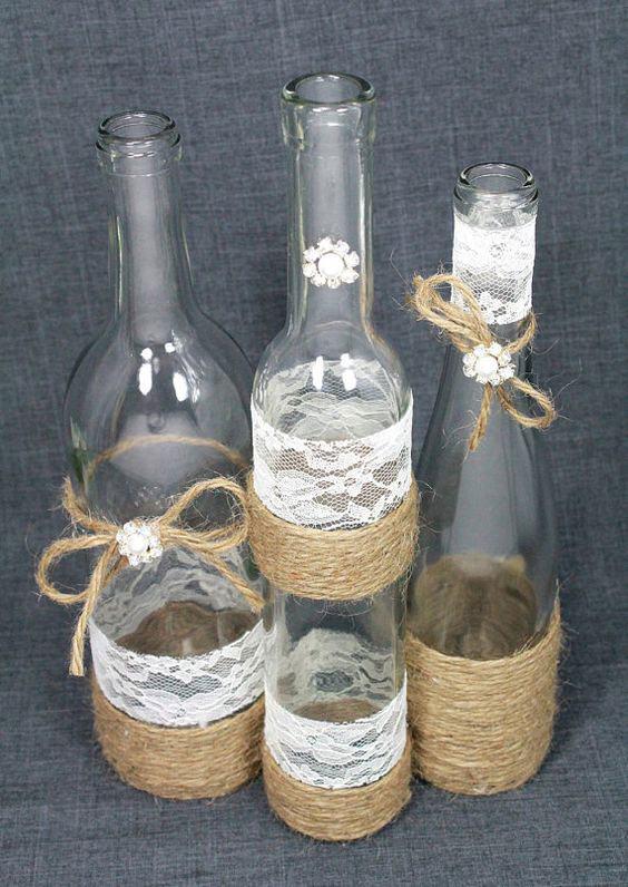 como decorar garrafas com barbante renda
