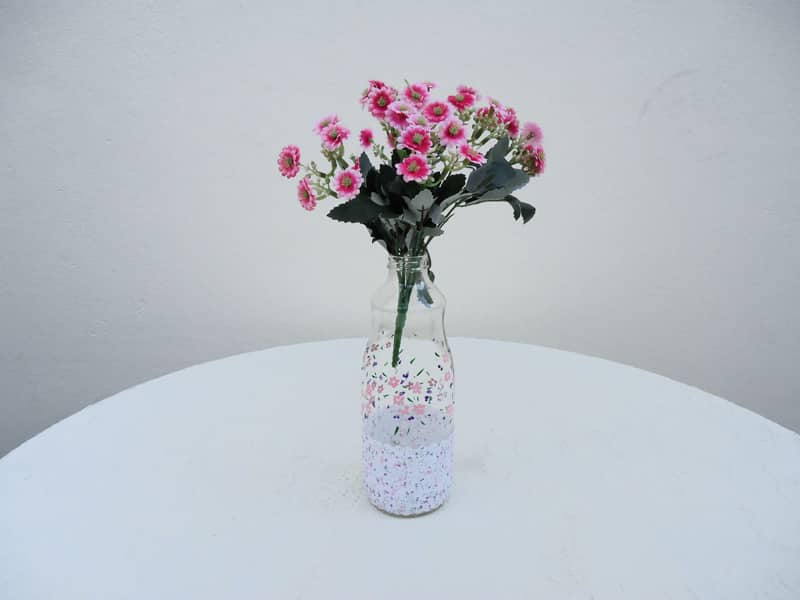 Comece separando todos os materiais que você vai utilizar em seu artesanato. Forre o local onde você vai trabalhar com a sua peça, com jornal velho, papel velho, papelão, tecido velho ou plástico. Se você quiser, aplique a tinta para fosquear vidro em toda a garrafa e deixe secar muito bem. Você também pode pintar a garrafa antes, se quiser. Vá aplicando a tinta em bisnaga pela garrafa, fazendo pontilhados em formatos desejados. Se quiser, desenhe em um papel os formatos desejados, fixe na garrafa e faça os pontinhos seguindo estes desenhos.