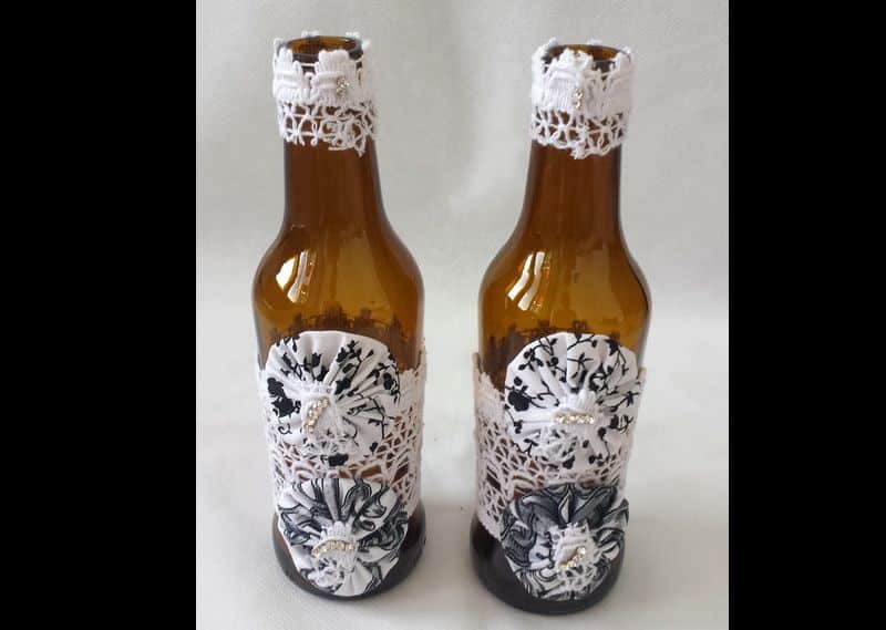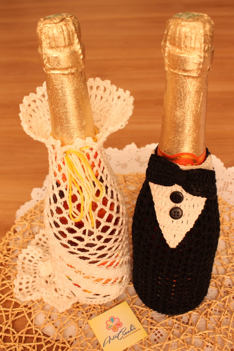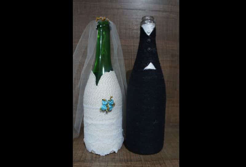 Você pode incrementar o seu grande dia com garrafas vestidas de noivos. Qualquer material pode ser usado neste caso.