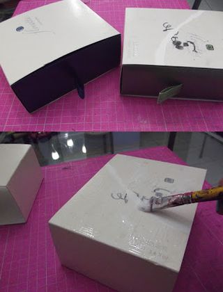 Comece retirando as gavetas de suas caixas. Aplique a cola em uma parte de uma caixa (para colar a outra por cima), com o auxílio do pincel, e posicione a outra caixa sobre a cola.