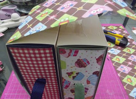 Em seguida, corte um pedaço do papel com o mesmo tamanho do fundo das gavetas e cole estes papéis.