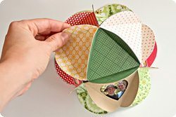 Para finalizar a sua peça, basta juntar as partes das extremidades, formando uma esfera, com as partes das fotos para fora. E está pronto! Você pode também usar apenas uma cor ou uma estampa de papel para fazer este artesanato.