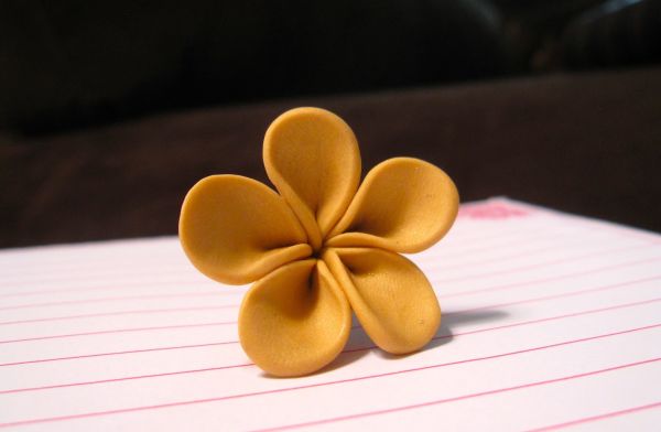 Agora, faça o mesmo processo para criar uma pétala com as outras bolinhas e assim que terminar de modelar a pétala, junte à pétala anterior, até resultar na sua flor com cinco pétalas. Leve ao forno a sua flor por um período de quinze minutos ou durante o tempo prescrito na embalagem da argila.