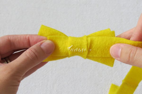 Agora, pegue a tira mais curta e prenda no centro do seu laço, com pontos à mão na parte de trás da gravata.