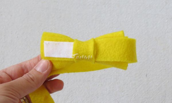 Em seguida, passe a tira de feltro com a medida do pescoço de seu filho pela tira que está no centro do laço.