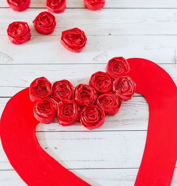 Termine de revestir todo o coração com as rosas de papel. Se achar necessário, faça rosas menores, para cobrir possíveis falhas.