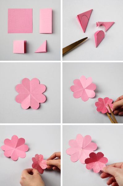 Em seguida, dobre o quadrado de papel ao meio, novamente ao meio e então em diagonal. Desenhe um formato arredondado na parte superior, para simular uma pétala, e recorte. Abra o papel e tenha a sua flor. Faça uma flor menor e faça um único corte entre uma dupla de pétalas. Cole as laterais das pétalas da flor menor, onde você fez o corte, para criar um efeito 3D ao final do seu artesanato.