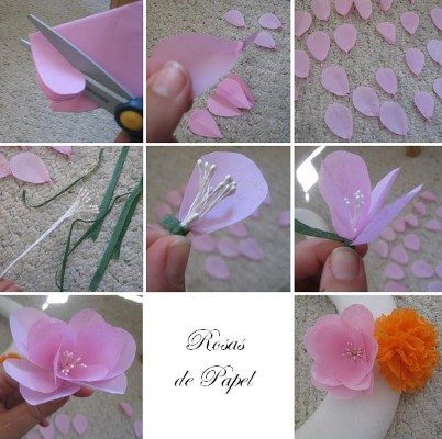 Comece fazendo flores de diferentes estilos, essa é a rosa, dobre o papel várias vezes ao meio Em seguida corte o formato de uma pétala, junte todas elas e no centro coloque pistilhos, a parte de baixo use fita floral para prender e o arame.