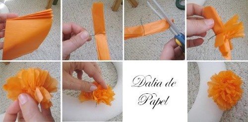 Agora faça as dálias! Dobre o papel várias vezes , em seguida prenda no meio com um arame e recorte das duas pontas, abra como se fosse um pompom.
