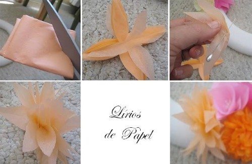 Os lírios de papel é fácil de fazer, dobre novamente uma outra cor de papel e recorte o modelo, una várias pétalas e finalize com um arame.