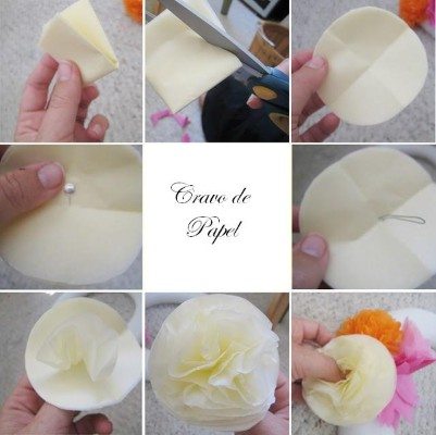 Agora faça o cravo de papel. Dobre a folha em quatro, recorte o formato de um círculo, em seguida faça dois furos no centro insira o arame e vá plissando as camadas de flores, até ficar com o resultado esperado.
