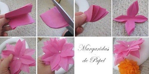 As margaridas são simples de serem elaboradas! Use 10 camadas de papel que deve ser dobrada ao meio e depois recortada no formato da pétala. Insira o pistilho no centro e gire as camadas para que não fiquem uma sobre a outra.