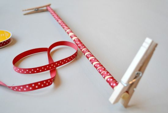 Comece preparando a fita decorada para fazer o seu artesanato. Para isso enrole um pedaço de fita em um palito com a espessura de sua preferência e prenda as pontas com os prendedores de roupas. Depois, borrife a goma sobre a fita e deixe secar, para que a fita fique toda enrolada. Quando a fita estiver seca, retire do palito e recorte com pedaços com tamanhos iguais e de sua preferência.