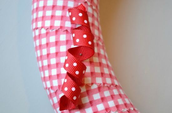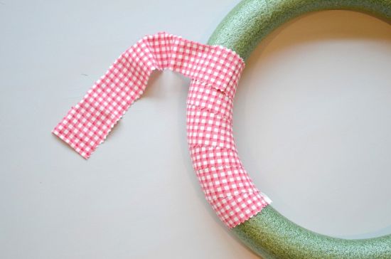 Em seguida, cole a ponta da faixa de tecido, com o auxílio da cola quente, na base de guirlanda e comece a enrolar a faixa. Ao final, cole também a ponta da faixa de tecido com o auxílio da cola quente.