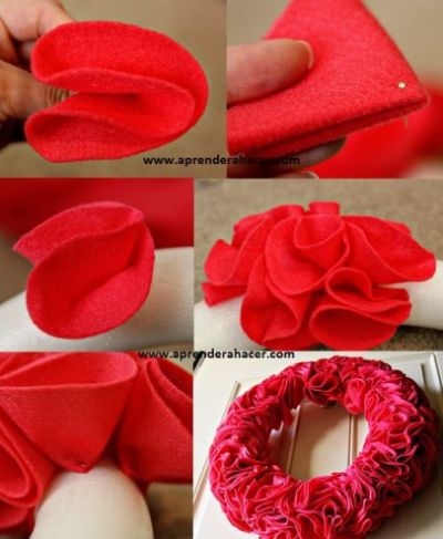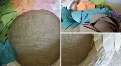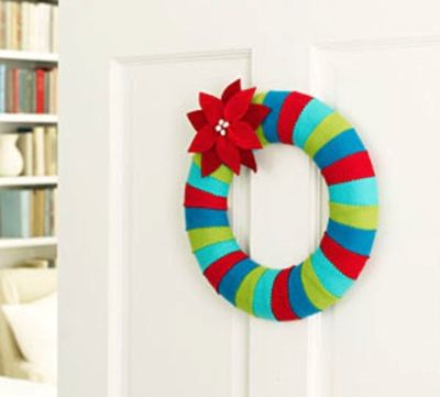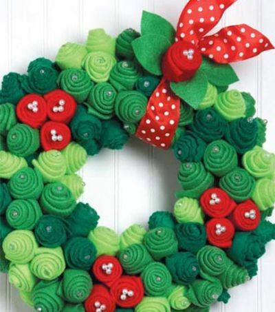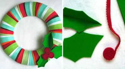 Em meio às ideias de guirlandas de Natal em feltro há modelos para iniciantes, como a guirlanda de Natal com retalhos de feltro, que você faz fixando os pedacinhos de feltro na base para guirlanda, com alfinetes para costura.