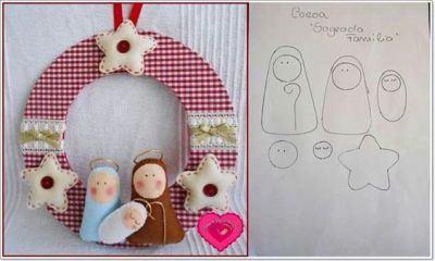 Costure a sagrada família na base para guirlanda e costure os outros enfeites. Prenda um pedaço de fita para pendurar. E está pronto!