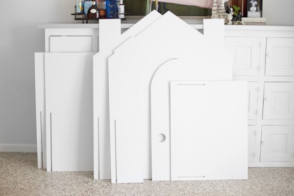 Em seguida, comece a montar a sua casinha. E se você quiser que ela fique bem firme, aplique cola quente nas emendas. Ou deixe as partes sem colar, para desmontar quando a sua criança parar de brincar.