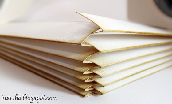 Logo após, faça a “sanfona” de papel. Agora, com o auxílio do carimbo com tinta com efeito envelhecedor carimbe as dobras da sua “sanfona”, para criar o efeito envelhecido nestes detalhes de sua caixa. E faça o mesmo nas outras partes “sanfonadas”.
