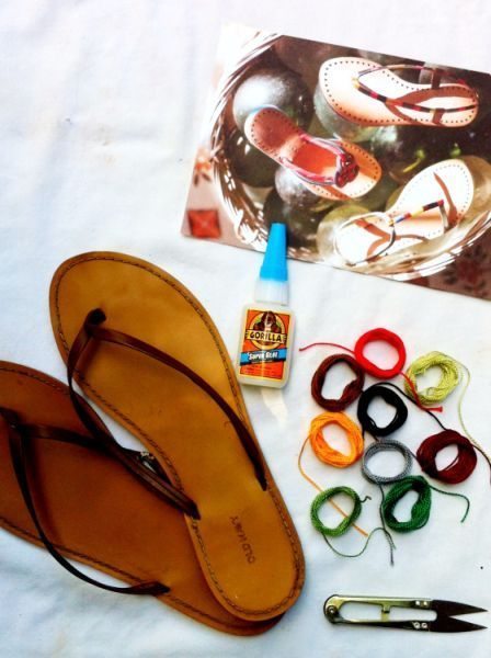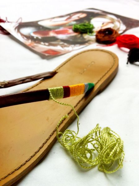 Comece decidindo qual a combinação de cores que você quer para a sua peça. Depois de decidido, separe as linhas para bordado ou as linhas para crochê que você vai utilizar em sua customização. E se for necessário, limpe muito as tiras de sua sandália, com um pano umedecido com álcool.