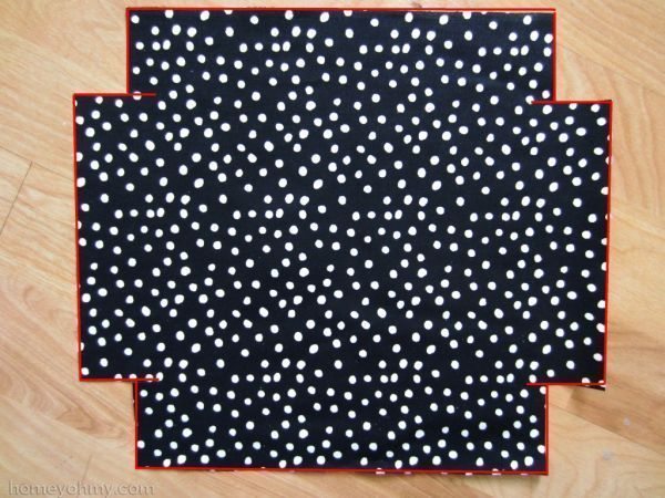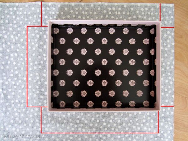 Logo após, posicione a tampa da caixa sobre o tecido escolhido e risque abas ao redor de toda a tampa.