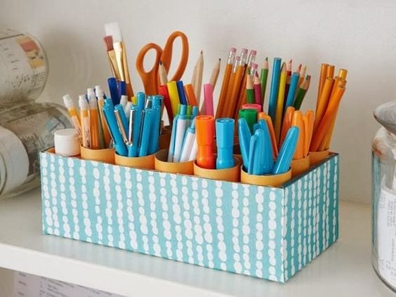 A tampa da caixa de sapato também pode acomodar peças para organizar a sua escrivaninha. E as partes internas podem ser feitas com outras caixas que foram recicladas.
