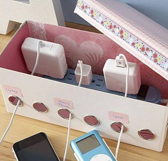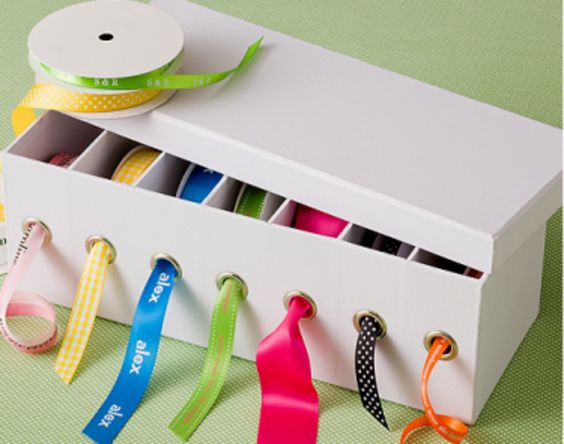 Mantenha fitas e fios organizados e “escondidos” dentro de caixas de sapatos com ilhós nos furos.