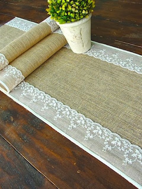 Para a sua mesa ou para a mesa da sua festa faça um caminho de mesa de juta. A decoração do caminho pode ficar por conta da renda. Você pode usar tanto um bico de renda quanto um entremeio de renda.
