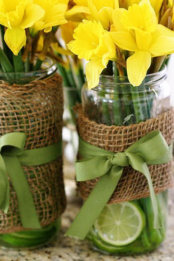 Potes de vidro podem ser enfeitados com juta tanto em seu corpo quanto em sua tampa. E podem ser objetos de decoração ou lembrancinhas.