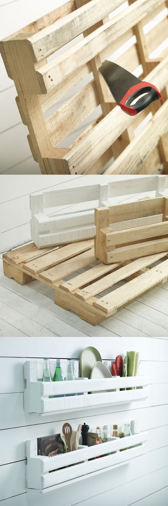 Comece separando todos os materiais que você vai utilizar em seu artesanato. Serre a peça ao meio, retirando ripas dos dois lados. Pregue as ripas retiradas na parte de baixo de cada parte criada. Pinte cada nicho de pallet com a cor escolhida. Se você quiser uma cor mais forte e intensa, aplique duas ou até mesmo três camadas de tinta, porém sempre deixando a tinta secar muito bem entre uma camada e outra. Deixe secar, fixe o ganho para pendurar na parede e pendure os seus nichos.