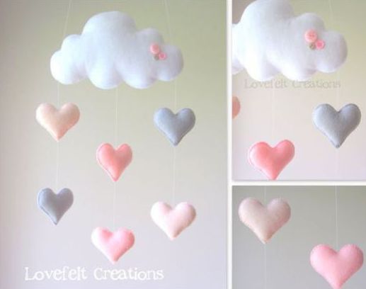 Falando em coração, você pode fazer vários com retalhos de feltro e manta acrílica e montar um móbile para o quarto de um bebê. Se os seus retalhos não forem o suficiente para fazer uma nuvem, você pode pendurar apenas os corações de feltro.