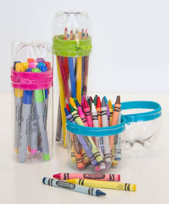 Entre as muitas ideias de artesanato com zíper há também as peças funcionais, como os estojos feitos com garrafa pet e zíper sendo colado nas bordas dos pedaços da garrafa pet. Ou ainda o porta-talheres que vira peça de jogo americano, que tem o zíper como componente-chave.