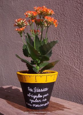 Pinte um vasinho com tinta-lousa e borda com modelo de régua ou com uma cor de sua preferência e escreva uma simpática mensagem para o mestre que irá receber o presente.