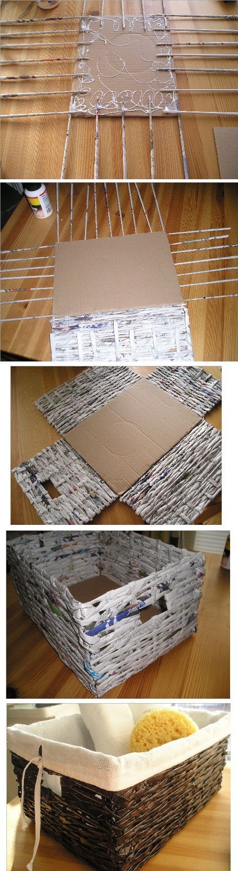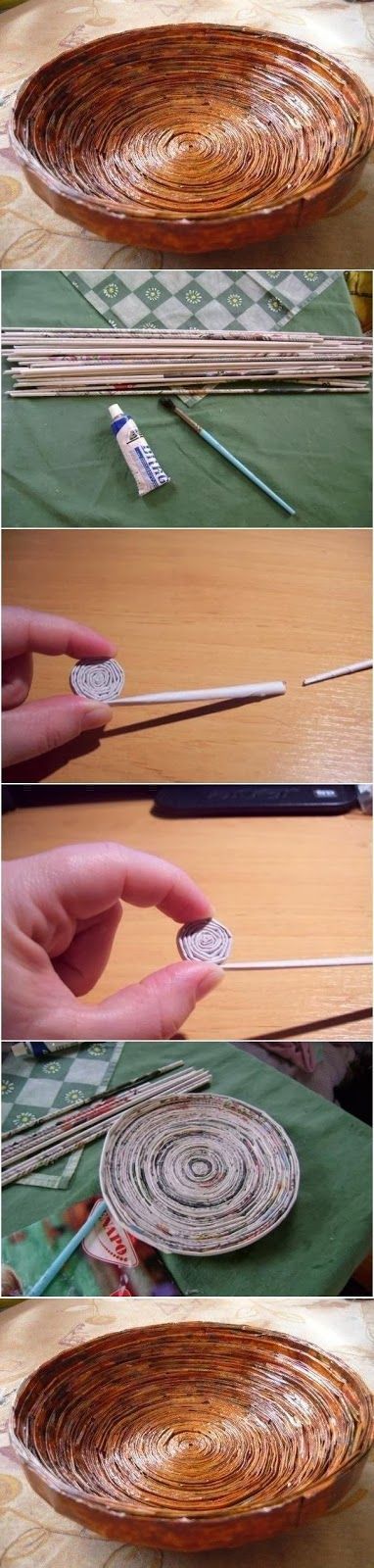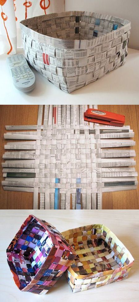 Há vários modelos de cestos, revisteiros e de caixas que podem ser feitos com jornal. A base é sempre a mesma, fazer muitos canudos de jornal, trançados da maneira que quiser, e depois impermeabilizar a peça, ao final do trabalho.