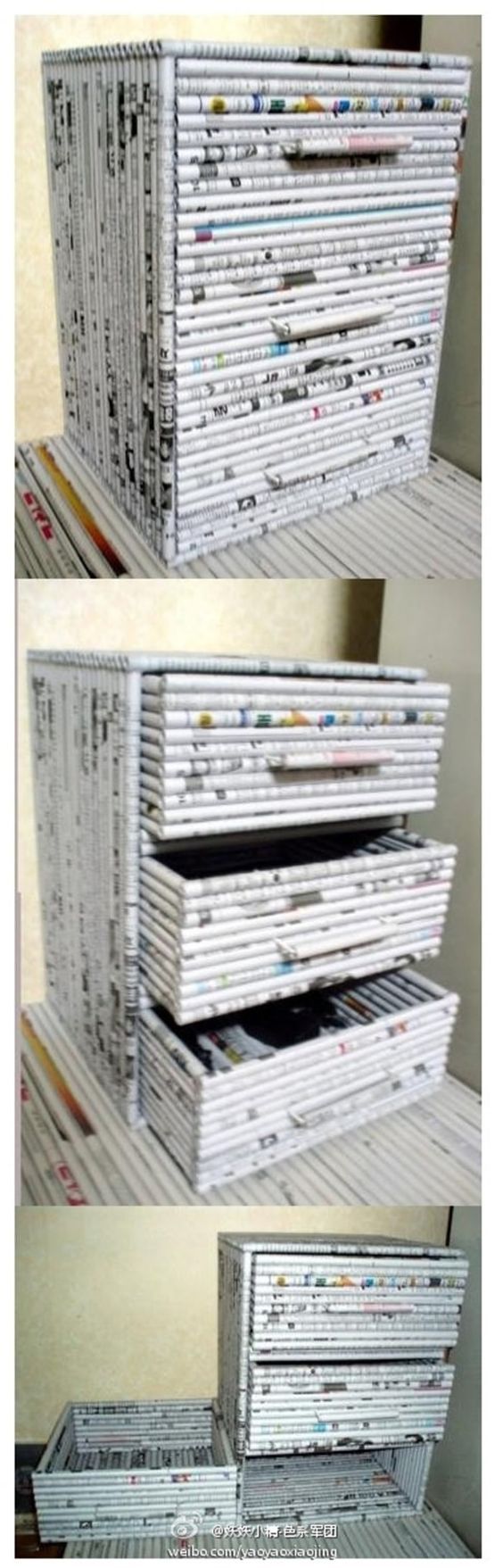 Até móveis você pode fazer com canudos de jornal. Mesinhas de apoio e gaveteiros organizam e decoram. Se você quiser pode também pintar as peças. Mas para que o móvel dure mais aplique algum produto para impermeabilizar a peça, como cola para decoupage ou várias camadas de verniz.