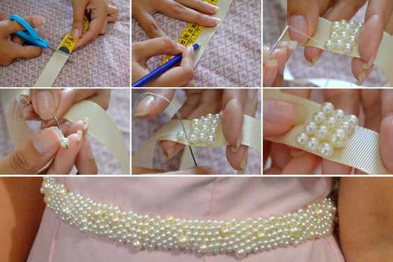 Entre as inúmeras ideias de artesanatos com pérolas destacam-se as customizações de roupas e os acessórios feitos com pérolas. Faça um cinto para incrementar os seus look cortando uma fita de cetim com um tamanho um pouco mais que o tamanho de sua cintura (para você amarrar na parte detrás do corpo e ainda fazer um laço) e borde pérolas por toda a fita.