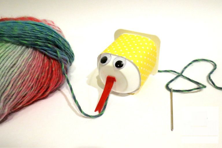 No pote de iogurte que será a cabeça da cobrinha, passe a linha pela agulha e passe pelo fundo do pote, de forma centralizada. Você também deve colar no fundo do pote os olhos e a língua, feita com fita ou com retalho de feltro vermelho.