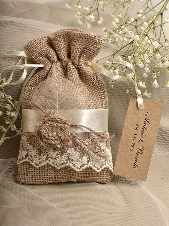 Para a lembrancinha de sua festa há a opção de saquinho de juta decorado com a renda, caixinhas diversas decoradas com a renda e as cestinhas com a renda forrando-as.