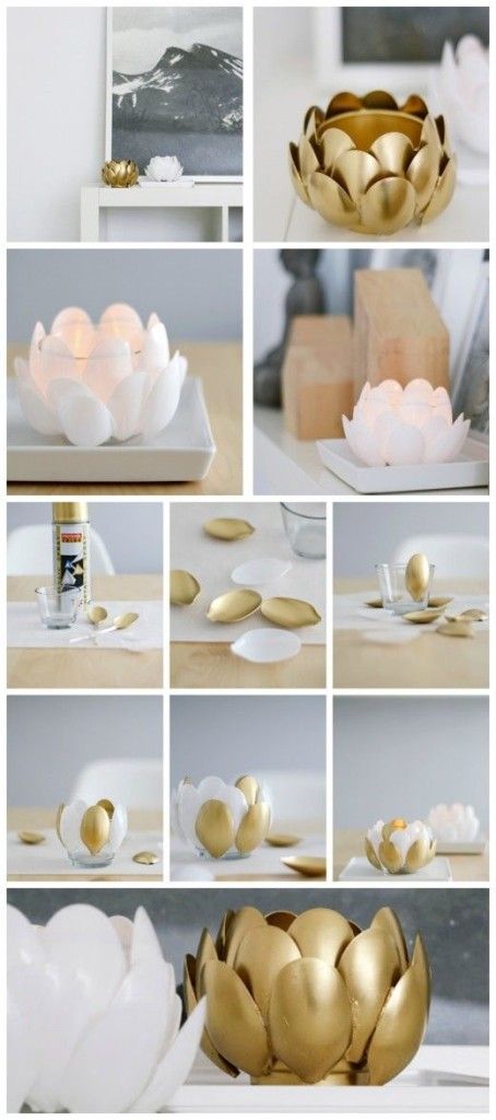 Você pode fazer um sofisticado suporte para vela com colheres de plástico sendo pintadas com tinta dourada. Utilize cola quente para colar as colheres de plástico ao redor da base.