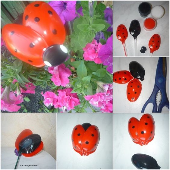 Seu jardim vai ficar lindo com joaninhas feitas com colheres de plástico. Pinte as colheres e cole-as, umas às outras, com o auxílio de pistola de cola quente.