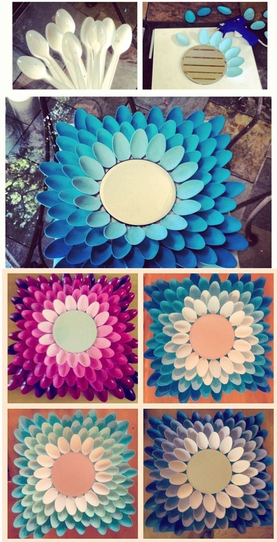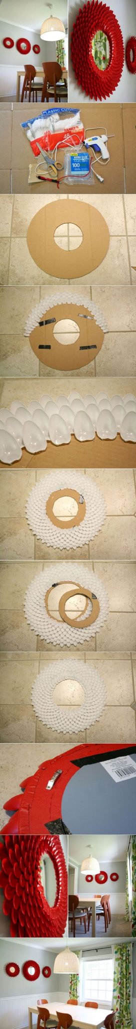 Seus espelhos ou fotos vão ficar lindos com uma moldura feita com colheres de plástico pintadas com cor de sua preferência e fixadas em um pedaço de papelão.