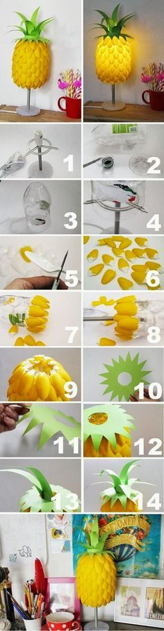 Faça uma luminária de mesa em formato de abacaxi com colheres de plásticos pintadas de amarelo, detalhe verde do abacaxi feito de papel e suporte para a luminária podendo ser um garrafão de plástico.