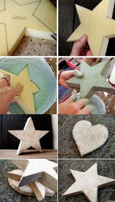 Comece separando todos os materiais que você vai utilizar em seu artesanato. Desenhe na espuma o formato que quiser. Recorte. No recipiente misture o cimento e a água, formando uma mistura bem líquida, com a quantidade de cimento de sua preferência. Se você quiser pendurar este enfeite em sua árvore de Natal, fixe um pedaço de cordão fino na parte superior. Mergulhe a peça na mistura de cimento. Deixe o enfeite dentro da mistura até o cimento penetrar na espuma. Retire o excesso de cimento do enfeite com os dedos. Deixe a peça secar ao sol sobre o papel-manteiga. Quando secar você pode pintar a peça com a tinta em spray e acrescentar o enfeite que desejar.