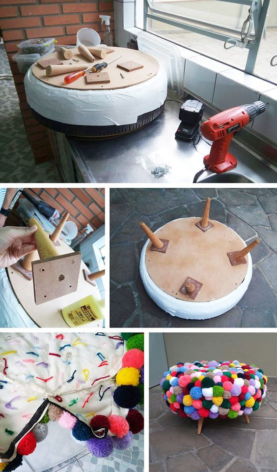 O pufe de pneu é velho conhecido de todos e fica ainda mais simpático quando decorado com pompons coloridos.