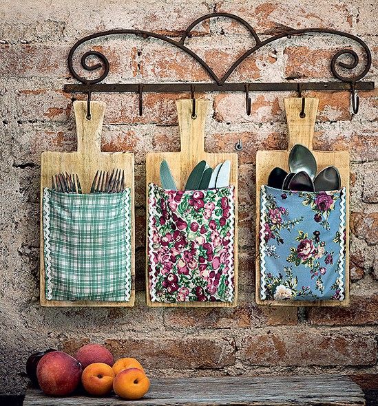 A sua cozinha vai ficar decorada com primor com tábuas de carne penduradas na parede, que recebem um “bolso” de tecido para acomodar utensílios de cozinha.