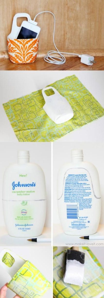 Com vidros de shampoo ou de condicionador você pode fazer um suporte para carregar celular. Corte o vidro de forma a criar uma alça e enfeite a peça como desejar.