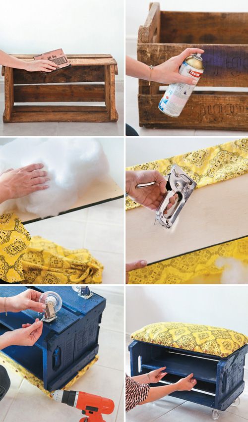 Se falta banquinho ou pufe em sua casa, customize uma caixa de madeira e crie um banquinho, bem diferente e muito interesse.