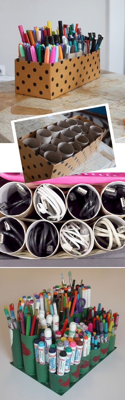 Entre as ideias de artesanatos feitos com reciclagem está o organizador feito com rolos de papel higiênico. Esta peça pode ter vários modelos diferentes e pode também acomodar vários itens, desse lápis até fones de ouvido, por exemplo.