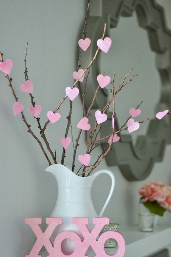 Galhos secos podem receber corações e irem parar dentro de um vaso ou de outra peça e decorar a sua sala.
