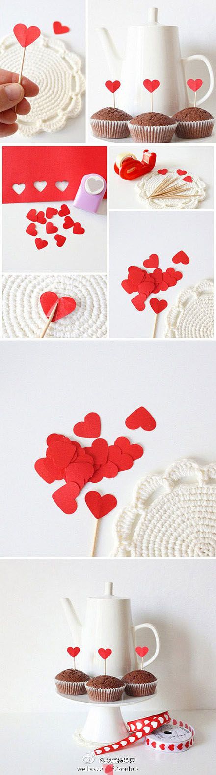 Para o café da manhã de vocês vale colar dois corações em um palito de dente, para decorar os cupcake ou pãezinhos que você for servir. Estes corações podem ser de papel e colados com cola comum ou serem adesivos.